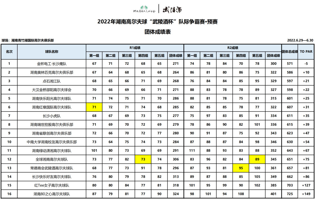 北京时间6月30日,由湖南省高尔夫球协会主办、湖南武陵酒有限公司冠名、广州壹杆体育运动有限公司协办的2022年湖南省高尔夫球“武陵酒杯”队际争霸赛,在湖南青竹湖国际高尔夫球会结束预赛晋级名额争夺。来自湖南各地区的16支业余球队、160名各行各业的高尔夫球精英选手齐聚青竹湖,展开了本年度的角逐。