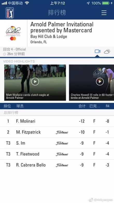 北京时间3月11日,阿诺-帕尔默邀请赛在奥兰多郊外的湾丘高尔夫俱乐部结束争夺,意大利选手弗兰西斯科-莫里纳利(Francesco Molinari)决赛轮力挽狂澜狂抓8只小鸟交出64杆,低于标准杆8杆,总杆以276杆(-12),从落后5杆追起,最后逆转领先2杆赢得阿诺-帕尔默邀请赛。